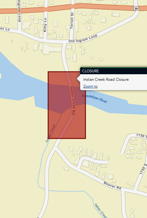 Motorists in the western portion of Kerr County are being notified that Indian Creek Road over the Guadalupe, located south of Old Ingram Loop, will be closed for repairs starting Friday, March 6, after 5 p.m.