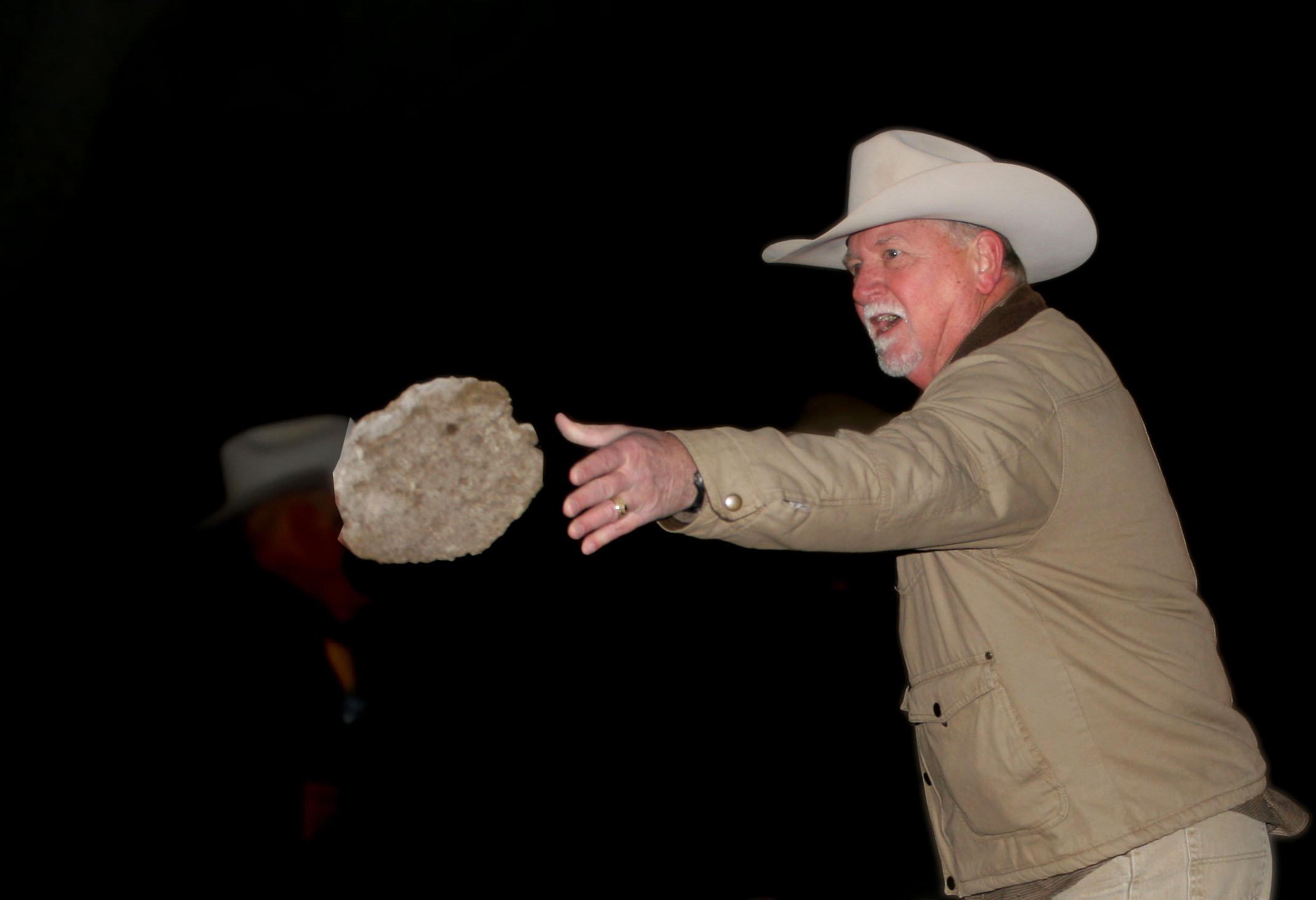 Having just taken the oath of office on Jan. 1 and making his debut appearance as a competitor, Commissioner (Pct. 1) Tom Jones (in top photo) won the cow chip toss -- a spirited competition between Kerr County and the City of Kerrville leaders.