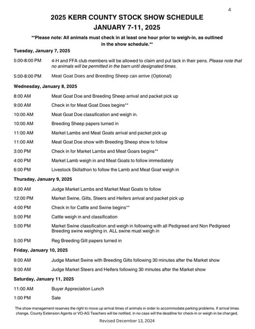 Judging in the county show kicks off tomorrow, Wednesday, Jan. 8, at the Hill Country Youth Event Center, 3785 TX-27 in Kerrville. The 2025 Kerr County Stock Show will continue through Friday, Jan. 10, and will conclude with a buyers appreciation lunch and a sale on Saturday, Jan. 11.