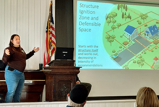 Dayziah Petruska, a Texas A&M Forest Service Wildland Urban Interface coordinator, interacts with residents gathered Feb. 19 at Union Church in Kerrville. Sponsored by Kerr County Emergency Management, the seminar covered information important for local residents to know when it comes to protecting themselves and their properties in the face of wildfire dangers. -- Photo by Lisa Walter, Director of Kerr County Public Relations