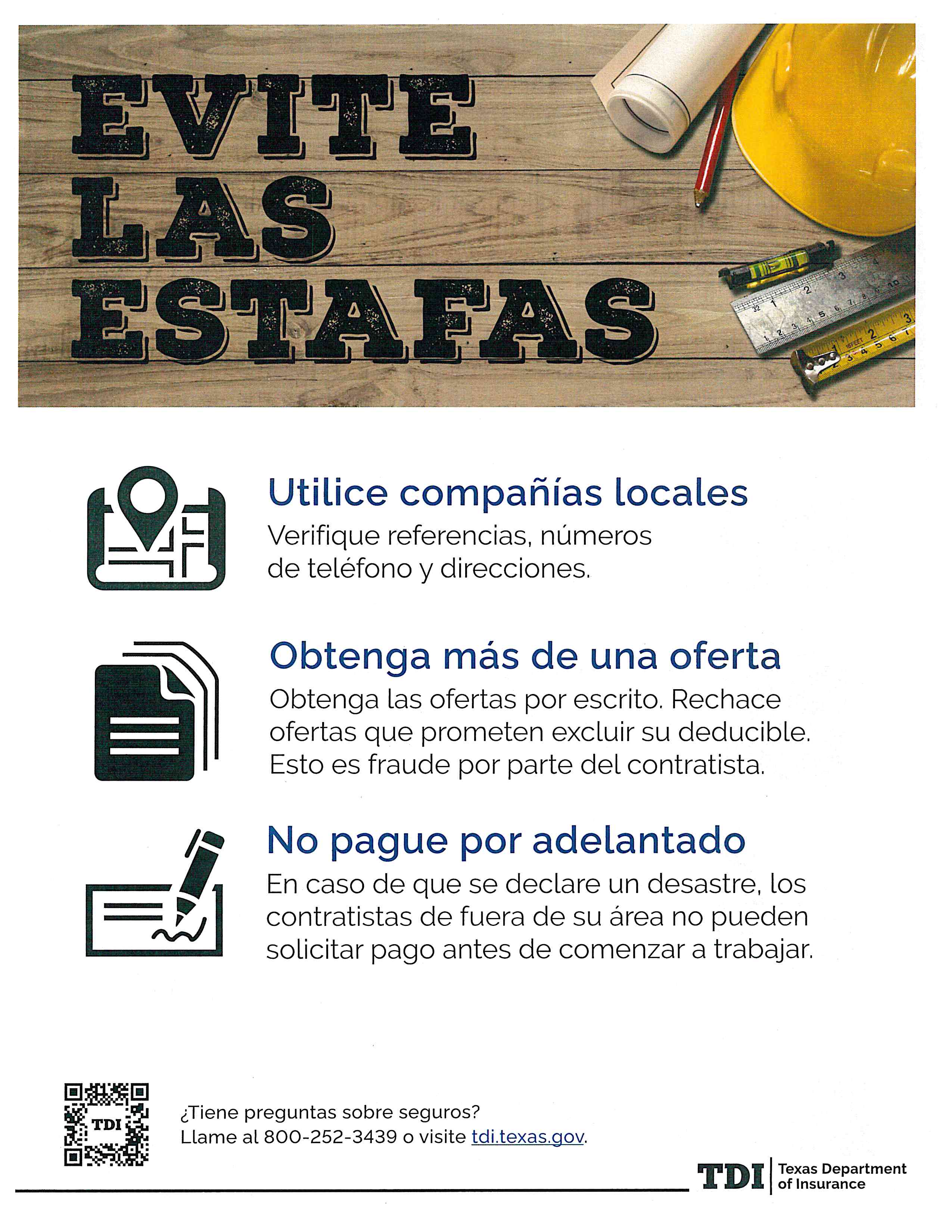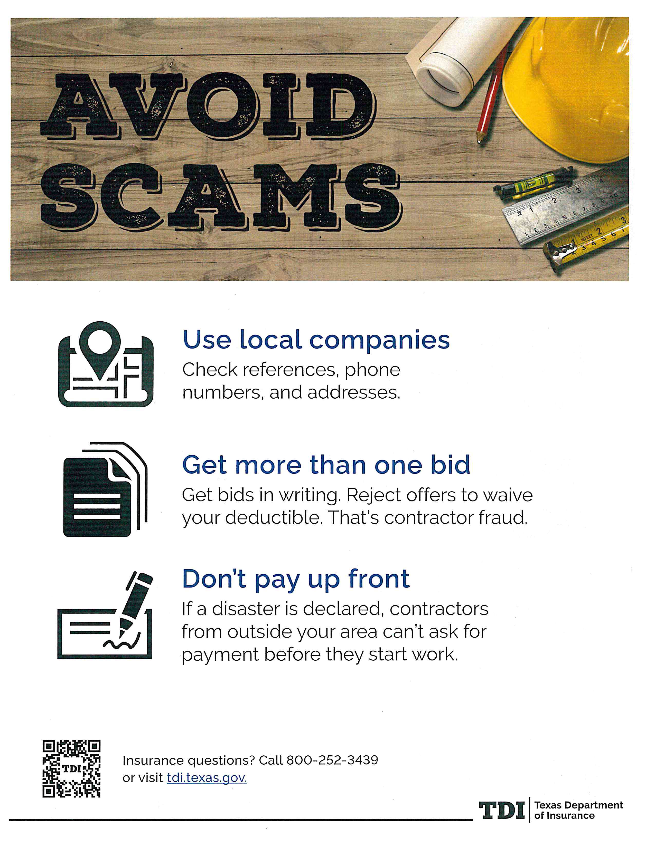 The information contained in the posters below comes from the Texas Department of Insurance and is designed to help residents prevent themselves from being scammed by fraudulent contractors.